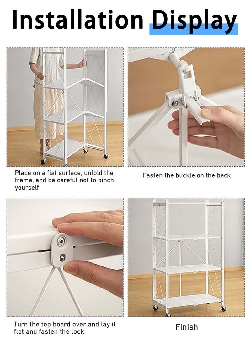 The 4 Tier Thickened Foldable Storage Rack with Wheels offers a convenient and versatile solution for organizing your home or workspace without the hassle of assembly. Designed with heavy-duty metal shelves, this shelving unit provides robust support and stability for storing a variety of items. Its four-tier design ensures ample storage capacity, making it perfect for keeping items neatly organized in the garage, kitchen, basement, pantry, or any other area where additional storage is needed. The integrated wheels allow for effortless mobility, enabling you to move the rack easily and position it wherever it's most convenient. Whether you're looking to declutter your living space or optimize storage in a busy environment, this rolling cart delivers functionality and durability in one practical package.